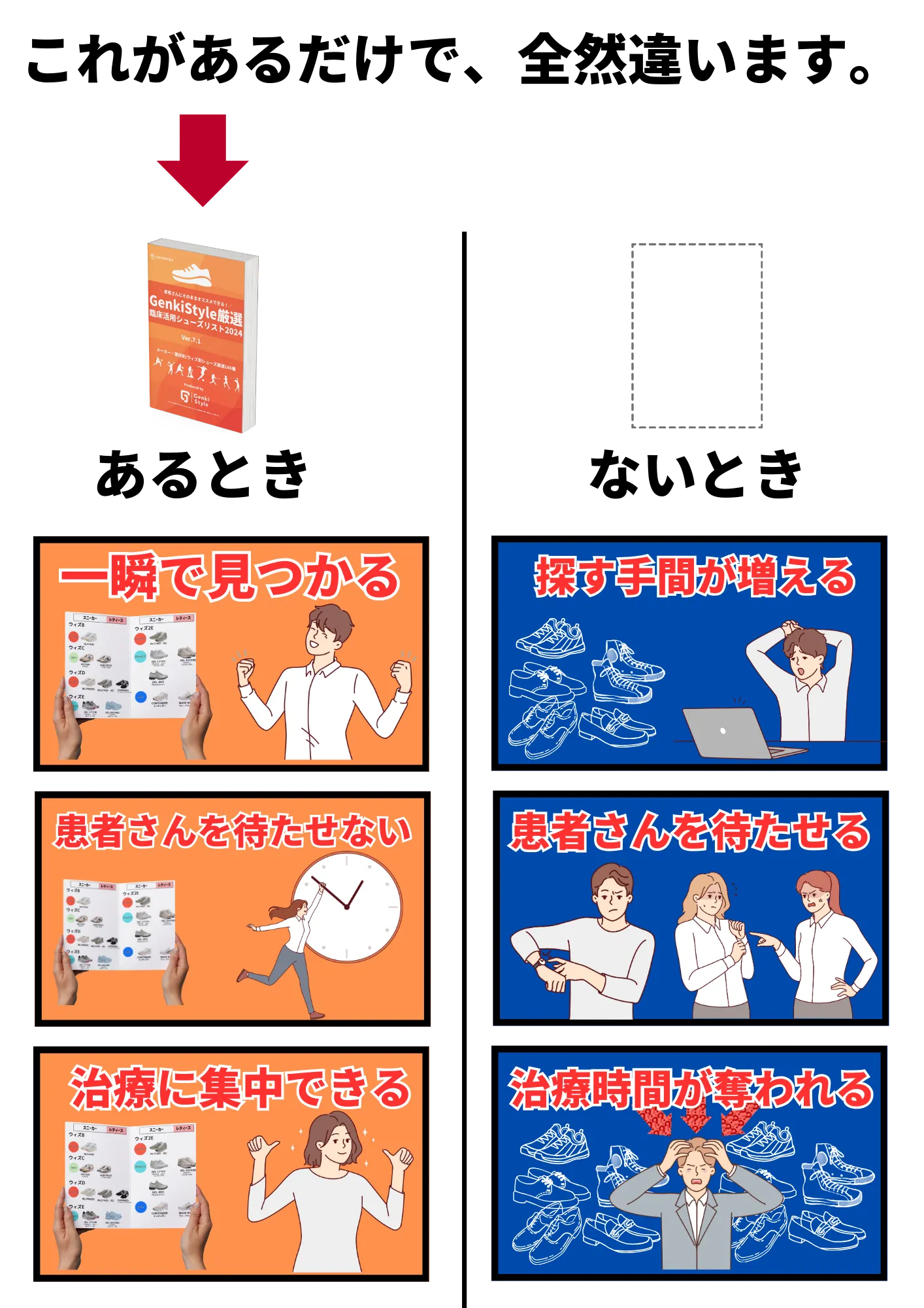 岩井元気先生と横山紗希先生が、あなたの代わりにすべての作業をしています。だからこそ、臨床でシューズを選ぶ時間が大幅に短縮できる。患者さんに対応できる時間が一気に増える。ということは、あとはあなたは治療に集中するだけです。